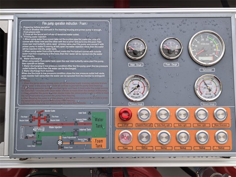 لوحة التحكم: يشتمل على مقياس سرعة الدوران، ومقياس الفراغ، ومقياس الضغط، ومقياس مستوى الرغوة، ومقياس مستوى الماء، وتعليمات التشغيل، ومخطط خط الأنابيب، ومؤشر ضوء PTO، وضوء صندوق المعدات، ومفتاح مضخة الفراغ، ومفتاح الإضاءة الخارجية، ومفتاح الطاقة الرئيسي، والتحكم الإلكتروني في الخانق، ومفتاح إيقاف الطوارئ، وأزرار أخرى.