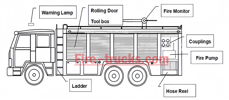 • غرفة المعدات: تقع هذه الغرفة في مقدمة هيكل المركبة، وهي مجهزة برفوف للمعدات وأرفف معلقة قابلة للسحب. صُممت الرفوف بشكل منطقي لتخزين مختلف معدات مكافحة الحرائق بشكل منظم (بدلات إطفاء، بطانيات إطفاء، أغطية خراطيم، جسور إطفاء، طفايات حريق، إلخ)؛ بينما توفر الأرفف المعلقة القابلة للسحب سهولة وسرعة الوصول إلى المعدات شائعة الاستخدام مثل فؤوس الإطفاء، والمعاول، والمجارف، والمفاتيح، والمطارق، والعَتلات، مما يُحسّن من كفاءة عمليات الإنقاذ.